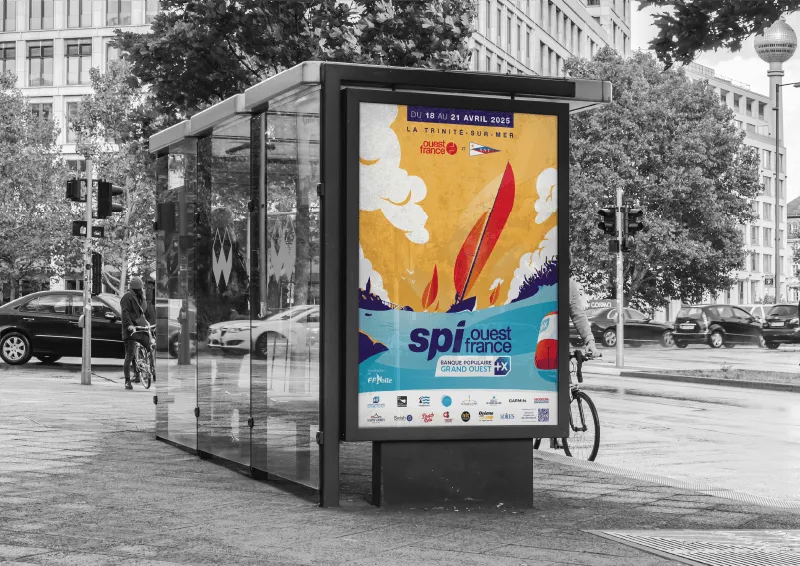 > Big Eddy a choisi une illustration originale et stylisée, avec des couleurs vives, dynamiques, s’appuyant sur les codes et les icônes de la régate morbihanaise.